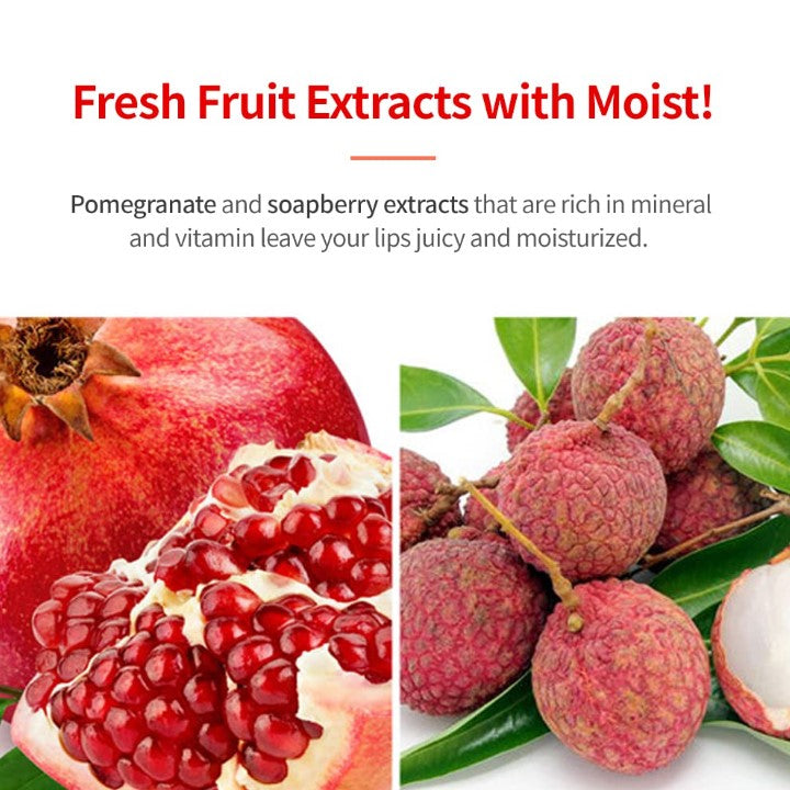 FRESH FRUIT EXTRACTS FOR MOISTURE-FULL LIPS: Pomegranate And Soapberry Extracts That Are Rich In Mineral And Vitamin Deliver Juicy, Fruity And Moisturized Finish To Your Lips