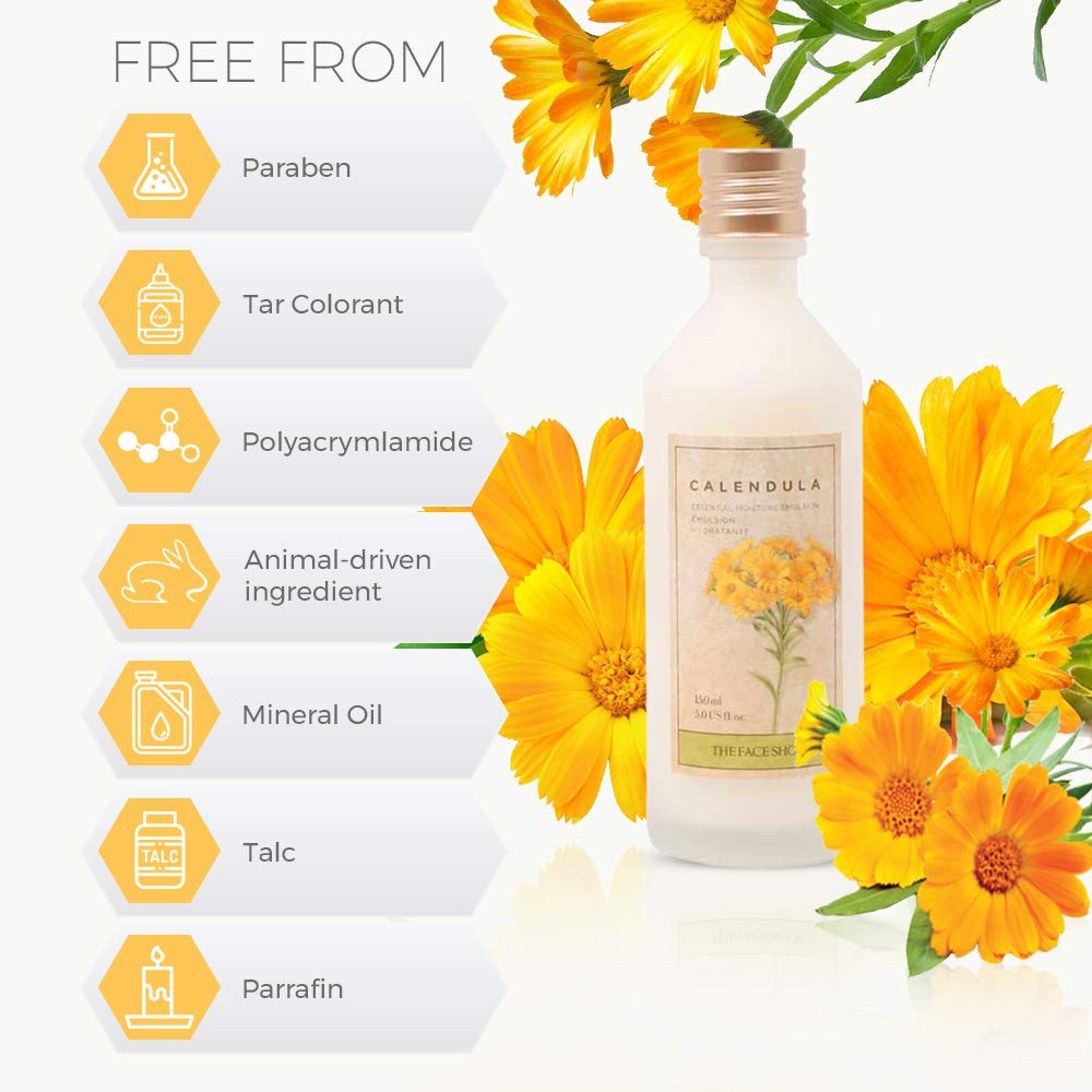 The Face Shop Calendula Essential Moisture Emulsion | Moisture Emulsion for Comfortable Rest & Optimal Moisture Ratio to Irritated Skin | Daily Skincare with Moisturizing & Soothing Formula, 5.0 Fl Oz