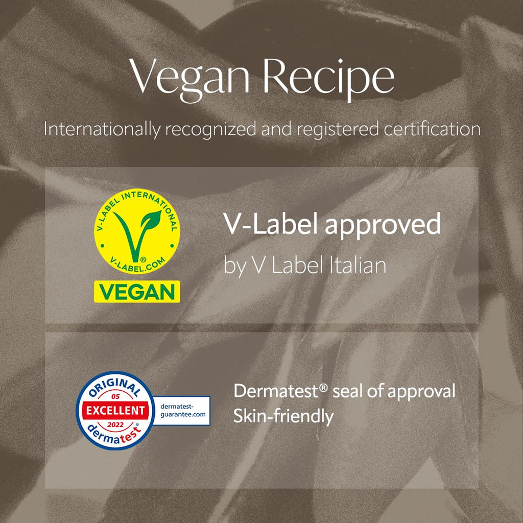 Certified Vegan after meticulous testing by Italian V-label, 50,000ppm of high concentrated Volufiline also patented for elasticity by Sederma in France, provides intense hydration, nourishment, and elasticity care.