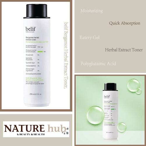 The Belif Bergamot Herbal Extract Toner is ideal for normal to combination skin types, features a watery gel system infused with Bergamot extracts, delivering a surge of moisture that effortlessly absorbs into the skin.