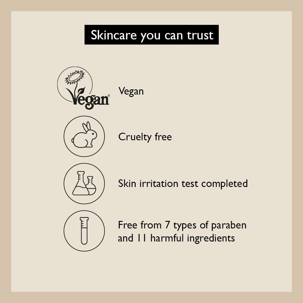 95% naturally-derived ingredients, vegan-friendly, cruelty-free, skin irritation test completed and made with EWG safe ingredients.