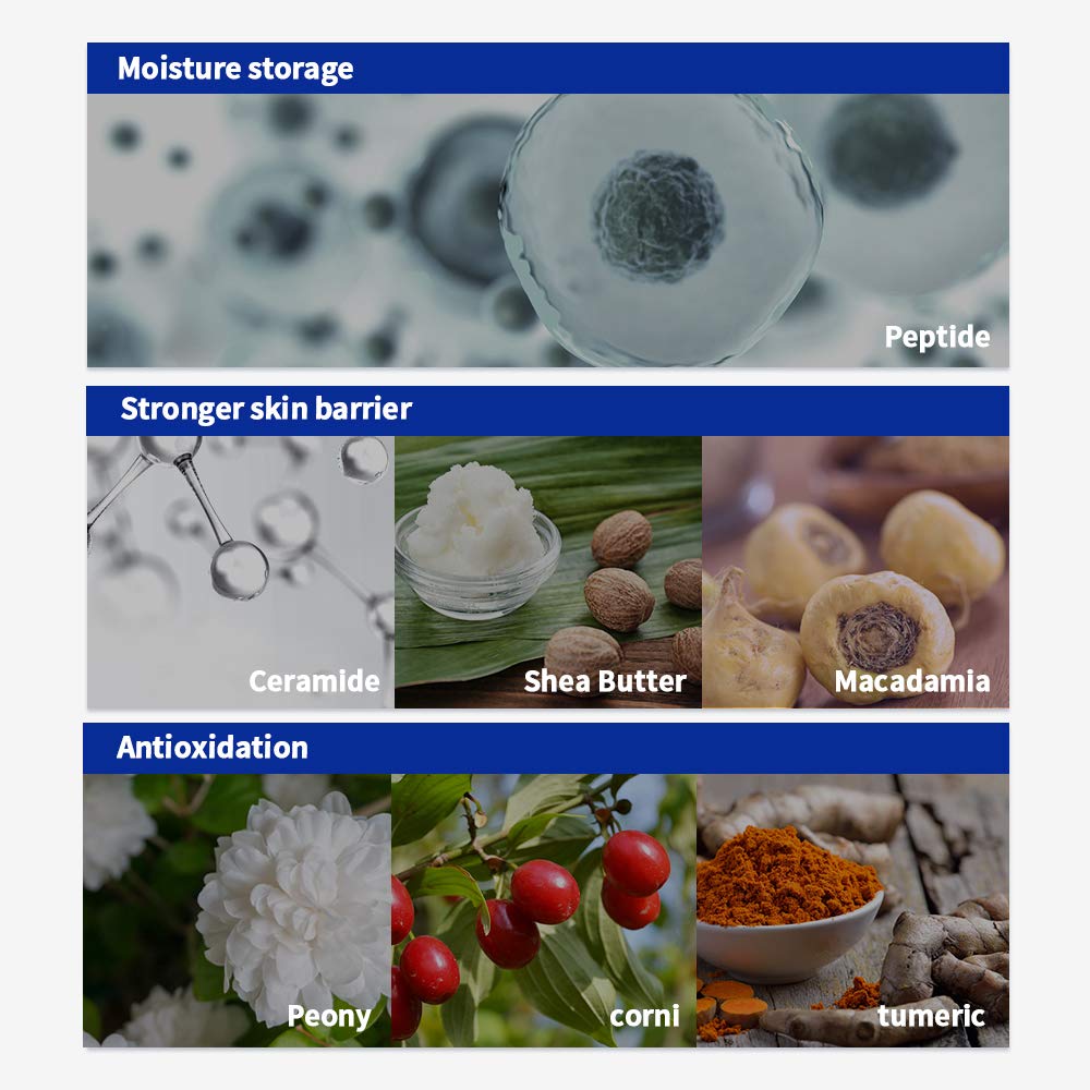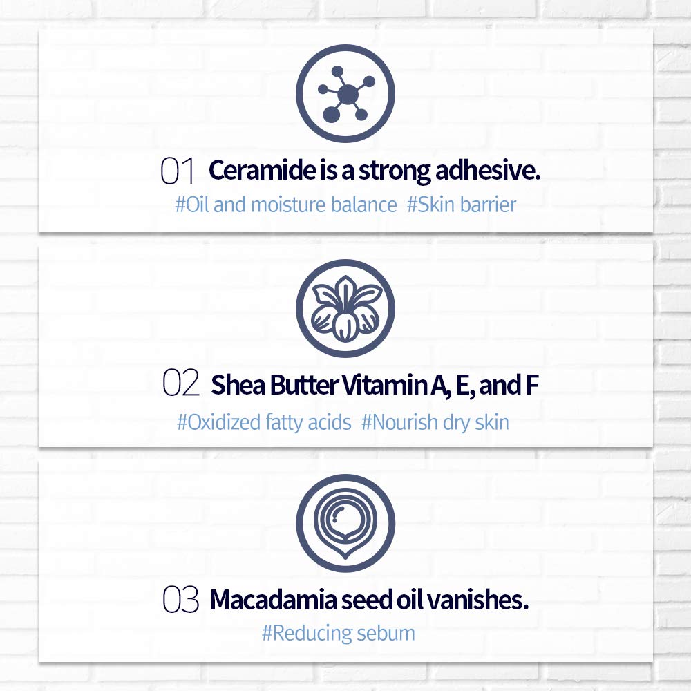 3-LAYER SKIN BARRIER - Ceramide in the cream plays the role of mortar which prevents moisture evaporation, adjusting oil and moisture balance properly while reinforcing an imbalanced skin barrier. Moreover, Shea Butter and Macadamia seed oil nurishes dry skin and reduce sebum resulting from aging skin.