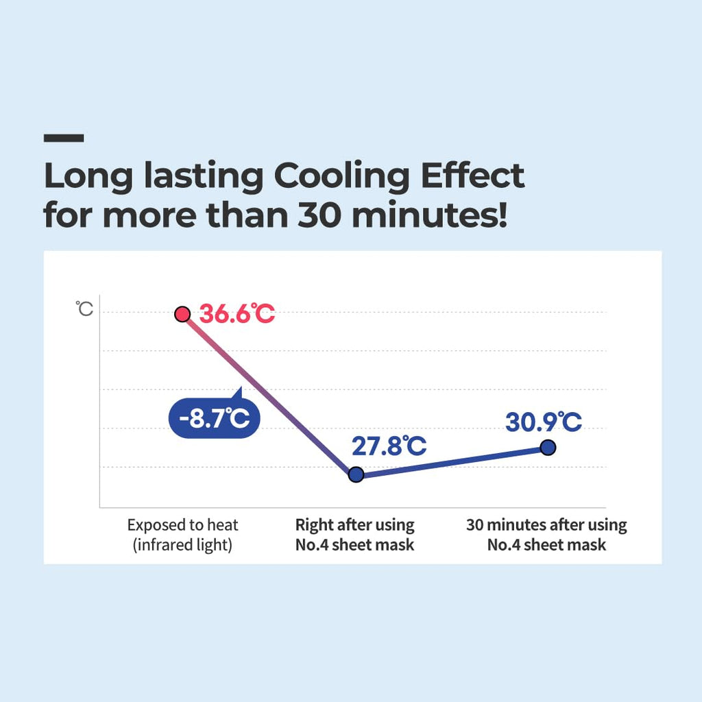[INSTANT COOLING & HYDRATION] This sheet mask provides an immediate cooling effect, reducing skin temperature without the use of alcohol or menthol. It's perfect for soothing heated and irritated skin.