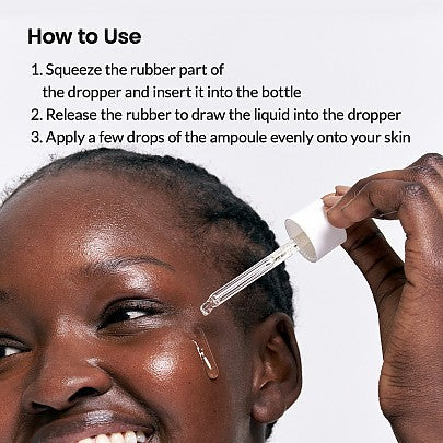 Squeeze the rubber part of the empty dropper first, and put it into the bottle and release the rubber. Apply a few droplets of the ampoule evenly on the skin.